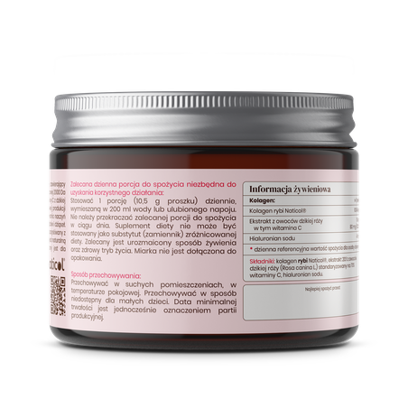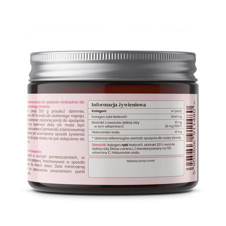 Kolagen rybi Naticol®, ekstrakt 20:1 z owoców dzikiej róży (Rosa canina L.) standaryzowany na 70% witaminy C, hialuronian sodu.